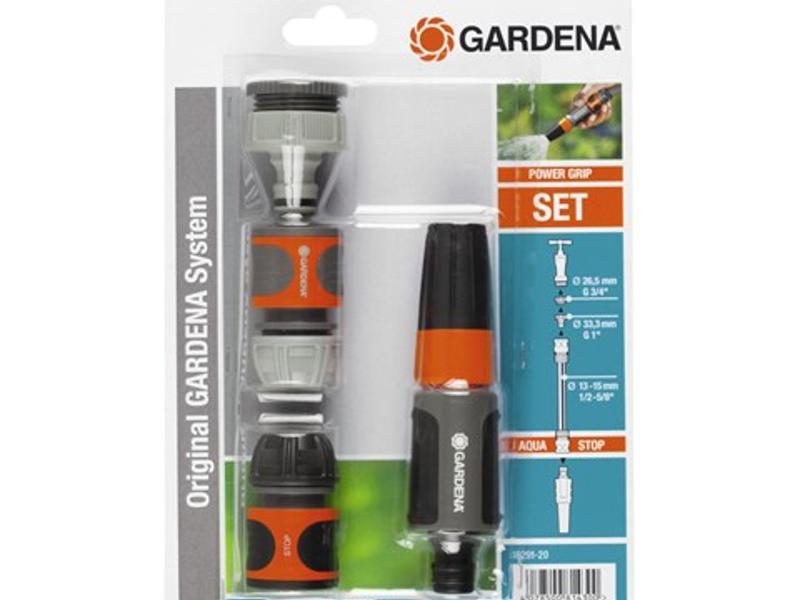 Gardena grunnsett består av en gjenget krankobling med en adapter (Art. nr. 18202 og 5305), en slangekobling (Art. nr. 18215) en vannstopper (Art. nr. 18213) og rengjøringsmunnstykket (Art. nr. 18300). Med dette settet har du alle de originale Gardena systemkoblingene og et rengjøringsmunnstykke for øyeblikkelig bruk av hageslangen.