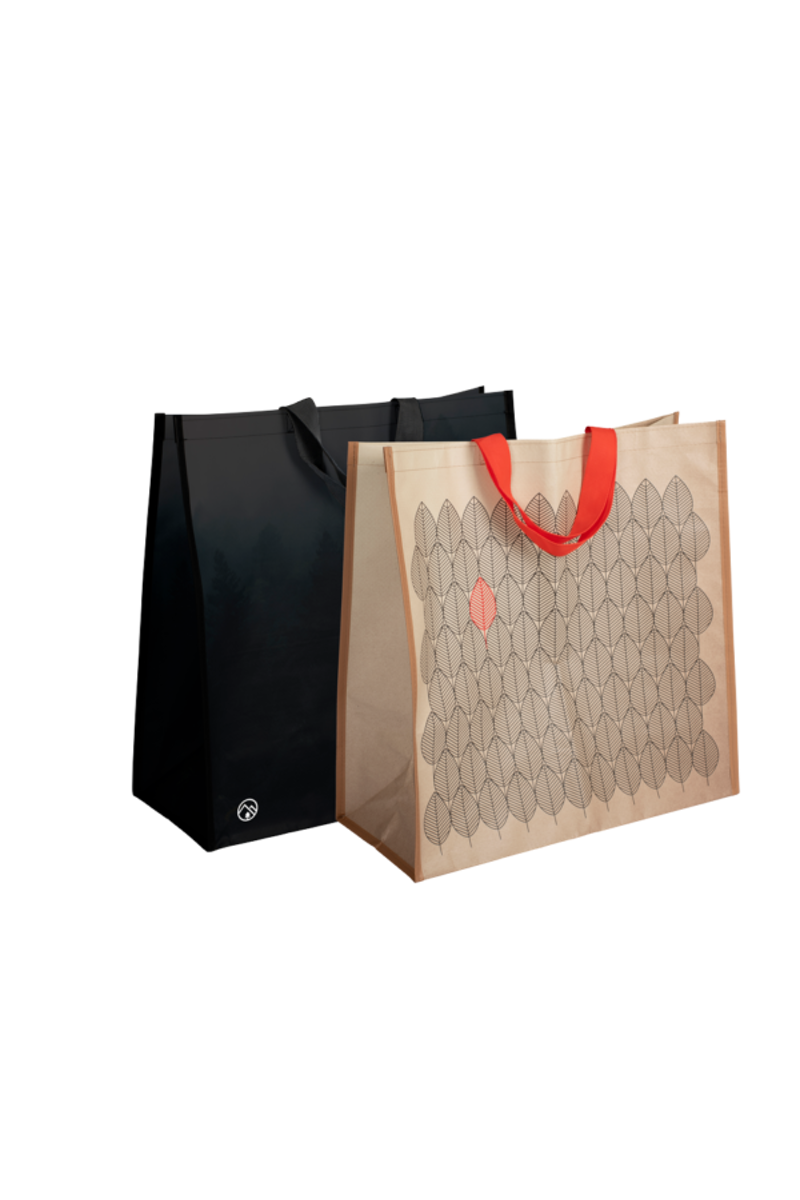 Stilig bag med flust av bruksområder. Kjekk å ha med til butikken, når man skal overraske med gaver eller ellers skal ut på tur. Store nylonhåndtak gjør den god å bære. Bagen har lang levetid som er godt for miljøet. To tidløse motiv – svart med logo og bladmønster. Volum: 45 L. H: 45 cm / B: 20 cm / L: 45 cm