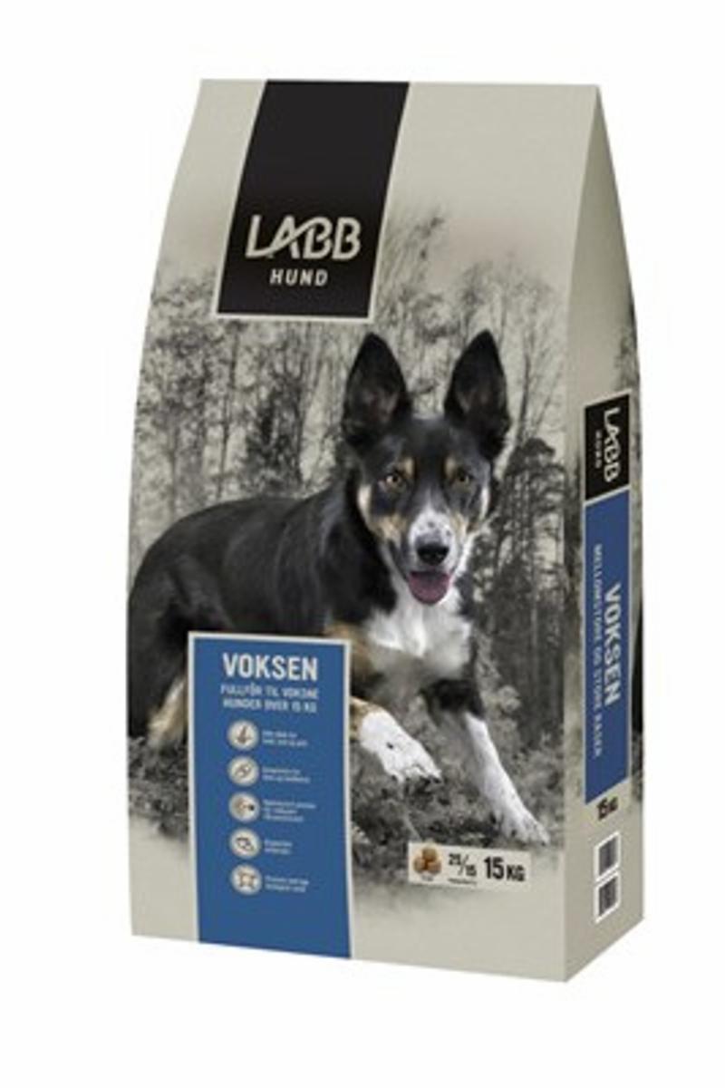 Labb Voksen har et høyt innhold av animalsk og marint protein og er tilpasset voksne hunder med normalt aktivitetsnivå. En stor andel hydrolysert protein bidrar til høy fordøyelighet og redusert fare for allergier. Kondroitin fra laks og kylling, samt lett tilgjengelig kalsium fra eggeskall, kan bidra til gode ledd og bein.