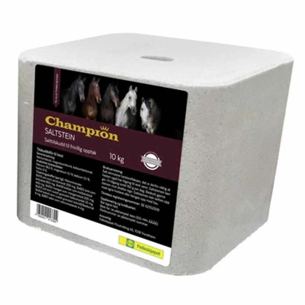 Champion Saltstein dekker ikke hele hestens mineralbehov alene. For dekning av mineralbehovet anbefales et av kraftfôrene i Champions blå serie, Champion Multitilskudd eller Champion VM-blokk. 10-kilos saltsteinen egner seg godt til bruk på beite og i luftegårder. Saltsteinen kan settes opp i egne holdere eller med tau. Bør beskyttes mot direkte regn.
