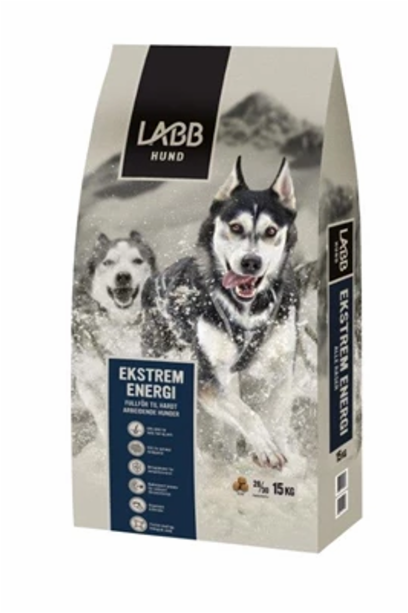 Labb Ekstrem Energi har høyt energiinnhold og et næringsinnhold tilpasset voksne hunder med svært høyt aktivitetsnivå som jakt- og trekkhunder.