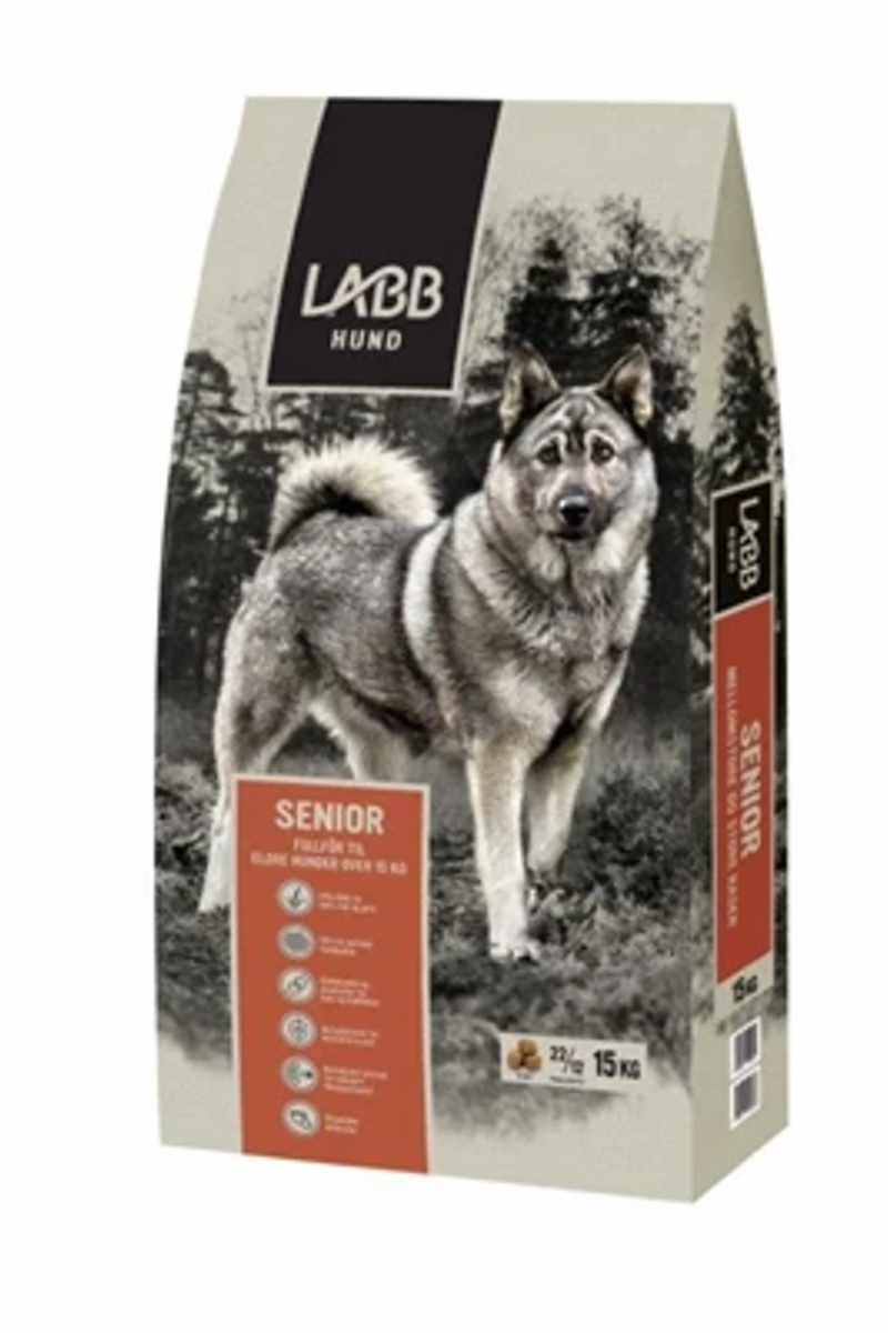 Labb Senior har et næringsinnhold tilpasset eldre hunder. Hunder eldes individuelt og det varierer fra individ til individ når det er gunstig å endre fôringen. Se www.labb.no for mer informasjon om fôring av aldrende hund. En stor andel av proteinet er hydrolysert kyllingprotein med høy fordøyelighet og lavt innhold av mulige allergener.