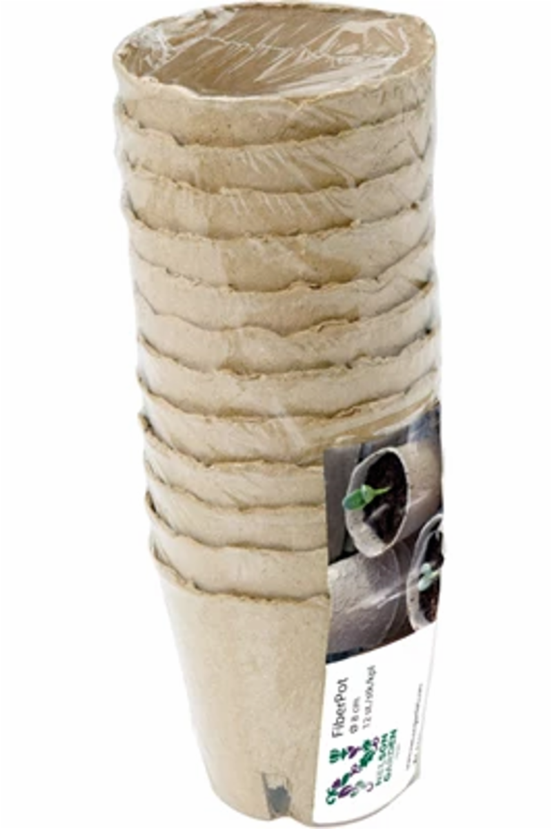 Fiberpotte til forkultivering. Passer utmerket i minidrivhus eller såkasser. Kan plantes direkte ut i jord siden potten nedbrytes. Av papirmasse fra resirkulert emballasjekartong.