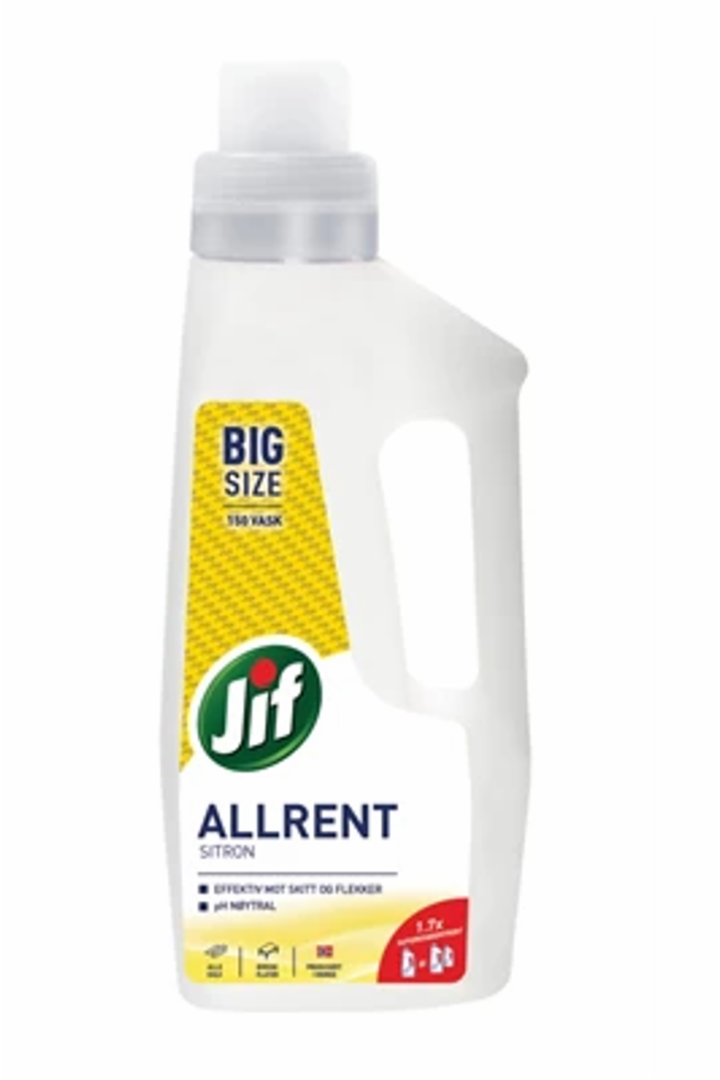 Jif Allrent er høykonsentrert, med hele 150 vask i flasken! Flasken er laget i 100% resirkulert plast og er et bedre valg for miljøet.