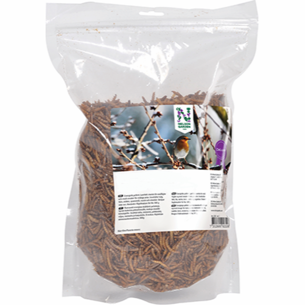 Melorm, eller tørkede larver av melormbille, inneholder mye protein og er en nyttig delikatesse for hagens fugler. Strø ut en håndfull eller bland med annen fuglemat. 300 g