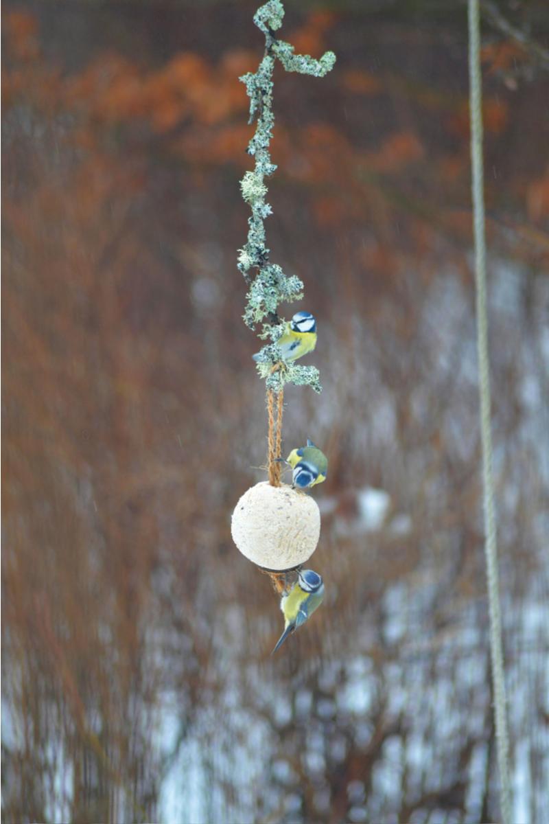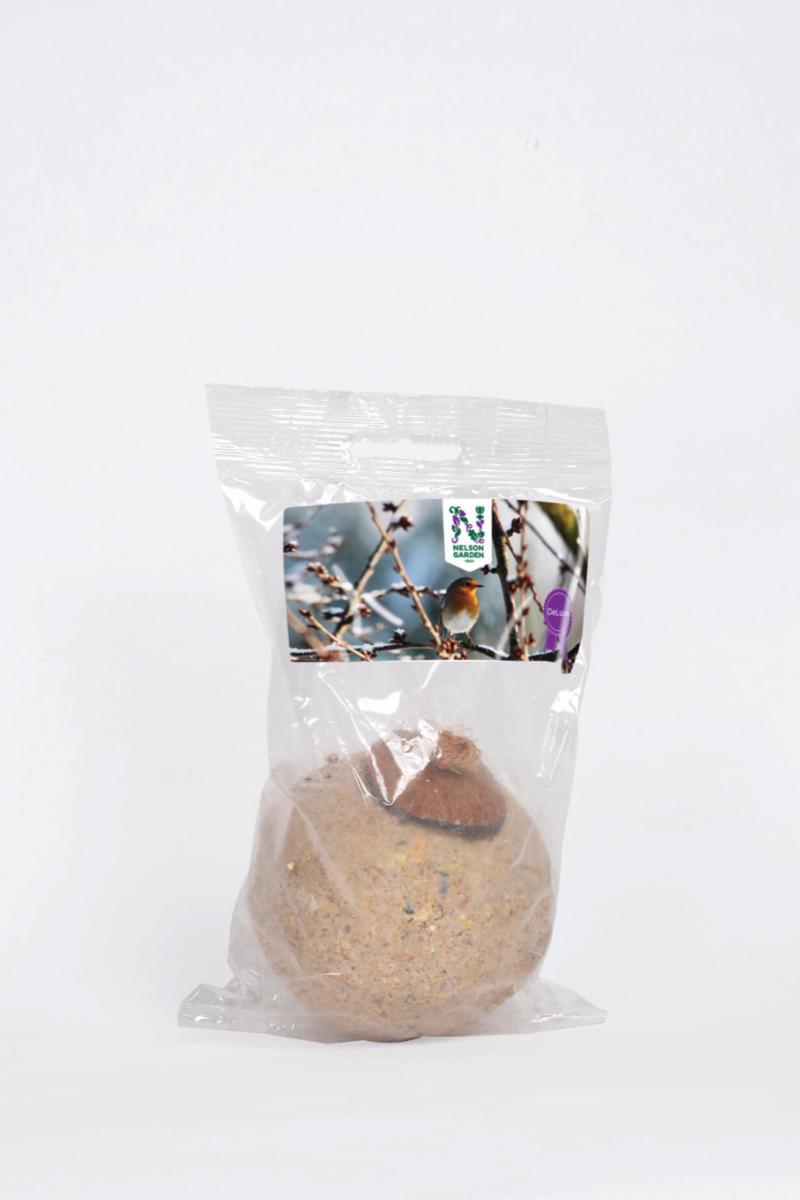 Stor meisebolle uten nett til foring av villfugl. Festet på en kokosplate med snor og kan henges på gren eller fuglematerstasjon. Energirikt innhold av fettholdige frø, talg og korn. 500 g