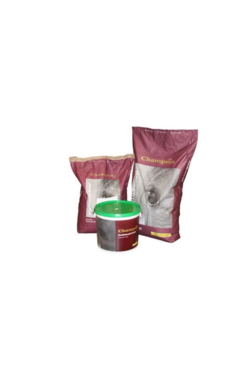 Champion Multitilskudd har et vitamin- og mineralinnhold tilpasset norsk grovfôr og hestens behov. Den pelleterte formen gjør det enklere å få hesten til å spise tilskuddet.Multitilskudd brukes når det gis mindre kraftfôrblanding enn det som er anbefalt. Finnes også som pulver. Vær oppmerksom på at produktet i pelletert og pulverform skal doseres ulikt.Forskjellen på Champion Multitilskudd i pelletert- og pulverform er at den pelleterte formen er blandet med korn og luserne for at det skal bli mulig på presse det til en pellets. Det betyr at noe av pelletsen er korn/luserne, og man trenger mer for å dekke hestens mineralbehov. For Champion Multitilskudd i pelletert form anbefales 25 g per 100 kg kroppsvekt. Av den pulveriserte formen anbefales 15 g per 100 kg kroppsvekt.