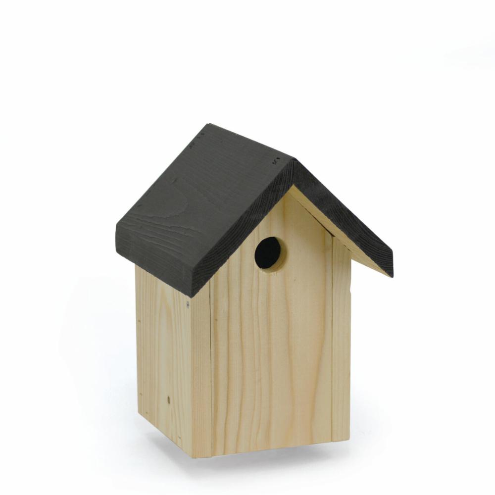 Tradisjonell fuglekasse med svart halvtak og 30 mm åpning. Fremsiden kan åpnes, noe som forenkler rengjøringen. Metallplate på baksiden for opphenging. Uhøvlet innside. Produsert av treavfall. Gran.