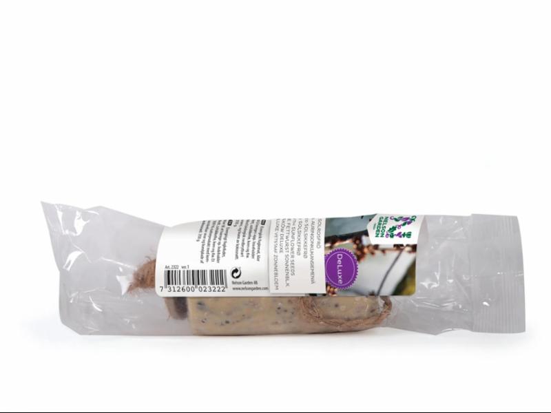 Energirik fuglemat, klar til å henges opp. Inneholder fett, solsikkefrø, korn og frø. Med biologisk nedbrytbart snøre, og bunn av kokosnøtt. 350 g.