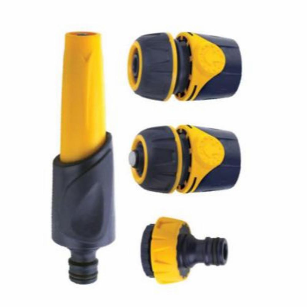 4 koblinger av plast/gummi. 1 stk skruekobling med 1/2" + 3/4" kobling og innvendig gjenge. 1 stk hurtigkobling. 1 stk stoppkobling. 1 stk munnstykke.