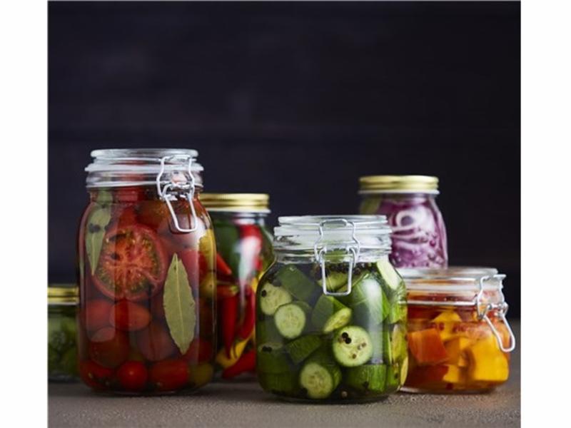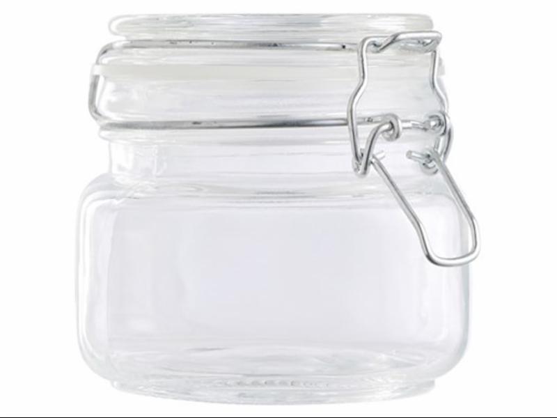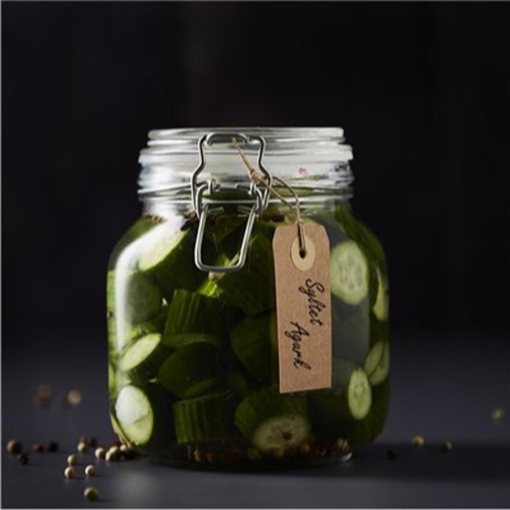 Sylteglass med vippelokk 0,5L Str.: 11x11x10cm. Skal glasset steriliseres med kokende vann skal den først forvarmes med varmt vann slik at glasset ikke sprekker.
