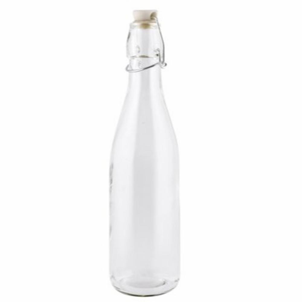 DAY 1 liter Saftflaske med vippekork som rommer 1,0 liter. Skal flasken steriliseres med kokende vann så skal den først forvarmes med varmt vann fra springen.