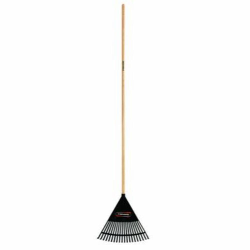 Løvrake med 20 flate pinner, treskaft og hode i plast. Bredde 445 mm. Total lengde 1970 mm.