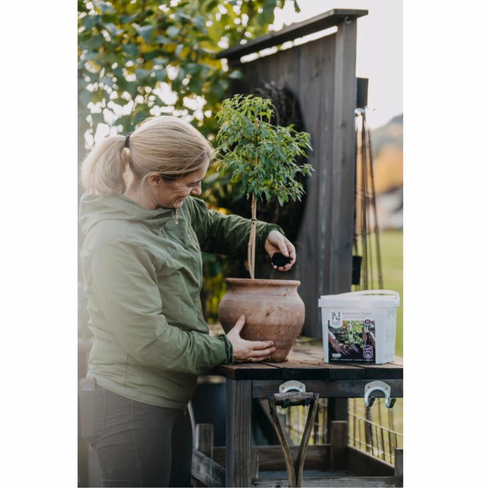 Ved planting i større potter og urner: bland en del Biohumus Terra med 50 liter jord.