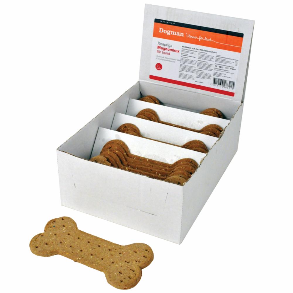 Sprø og smakfulle hundekjeks med lam og ris. Kjeksene i magnumstørrelse kan gis hele eller deles i mindre biter. Gis som godbit i tillegg til et balansert kosthold.