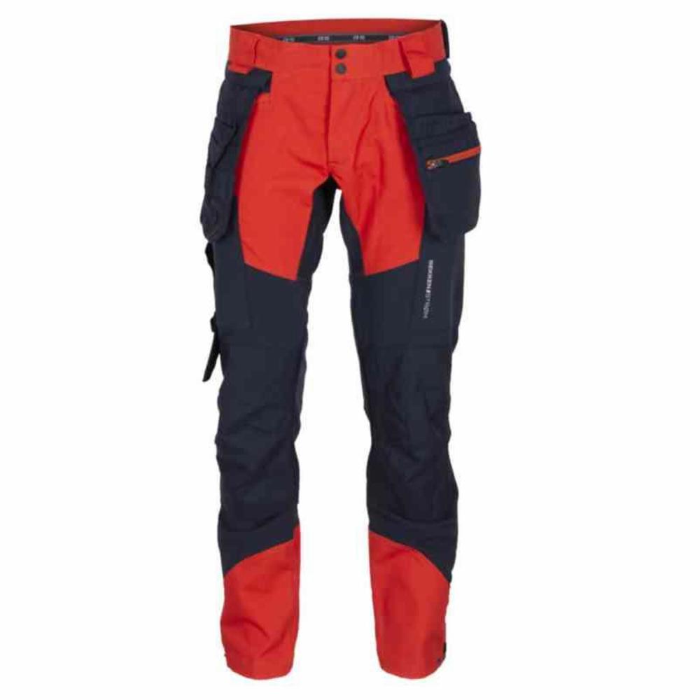 Håndverksbukse med formsydde ben og paneler i 4-veis stretch for best mulig bevegelsesfrihet. T-stykke i skritt. To-nålssøm i ben, lommer og skritt. YKK® glidelås i gylf, to trykknapper og borrelås i linning. Brede beltehemper. Hempe med borrelås til hammerholder i begge sider i linning. Forlommer med SBS glidelås. Hengelommer i slitesterkt nylon forsterket med dobbel bunn. Høyre hengelomme med ett fakk, to hylsterlommer og fire hemper. Venstre hengelomme med ett fakk, to hylsterlommer og bitslomme med SBS glidelås. Hengelommene er avtakbare med YKK® glidelås og trykknapper. Tommestokklomme i slitesterkt nylon med utvendig blyantlomme, skjult knapp for kniv og justerbart bånd for slire. Tommestokklommen er delvis festet for best mulig bevegelsesfrihet. Lårlomme med glidelås på høyre ben. Lårlomme med SBS glidelås og innvendig ID-kortholder på venstre ben. Formsydde kneputelommer i slitesterkt nylon med utvendig innputt. SBS støvelglidelås i benavslutning og trykknapp for justering av benvidde. Hovedmateriale: 94% polyester/6% elastan, 320 g/m2. Sekundærmateriale: 65% polyester/35% bomull, 260 g/m2. Forsterkningsmateriale: 100% nylon, 220 g/m2.