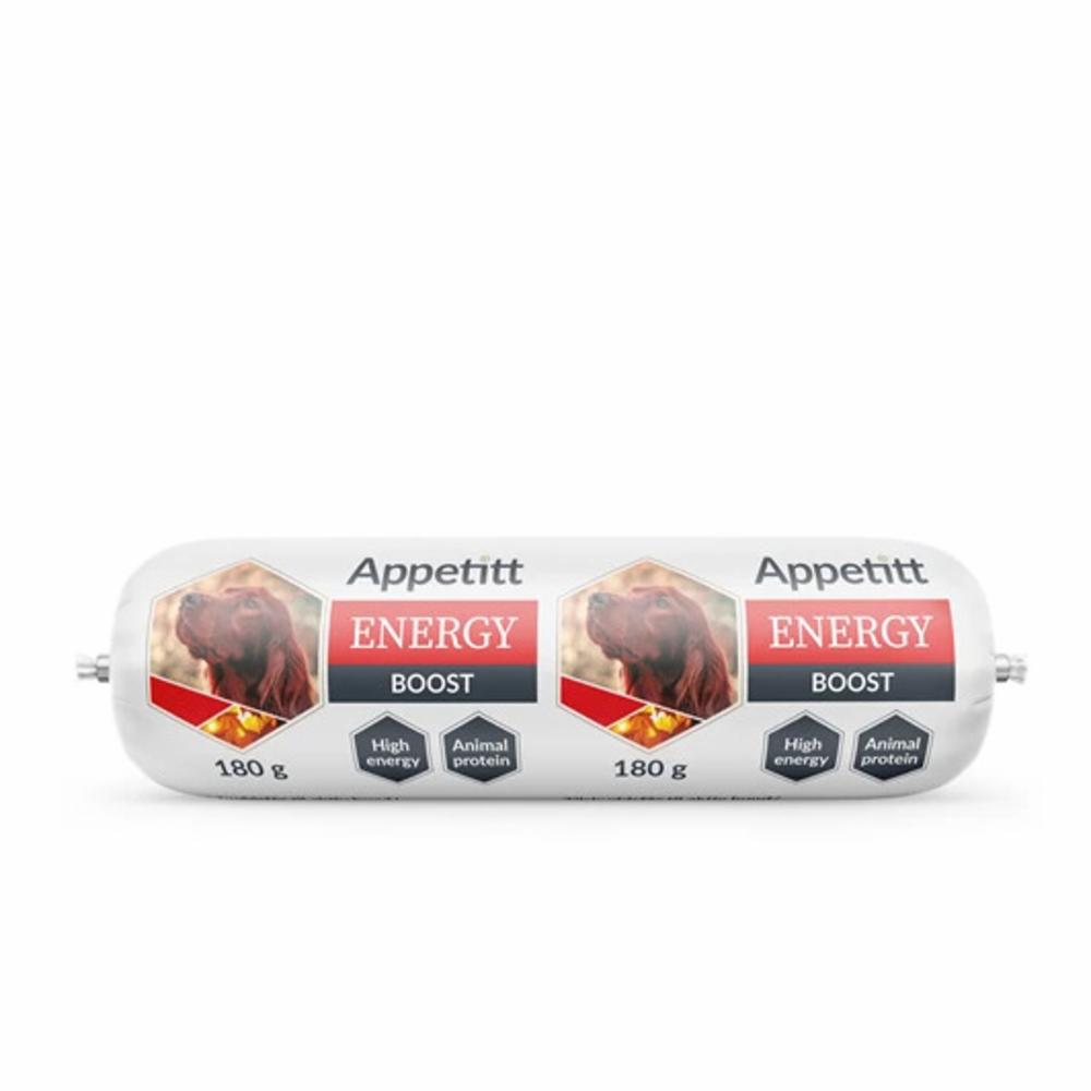 Appetitt Energy Boost er et høyenergi våtfôr til voksen aktiv hund. Fôret er svært smakelig, har et høyt kjøttinnhold og med energi fra animalsk og marint fett. Fôret er laget på glutenfri resept, det vil si