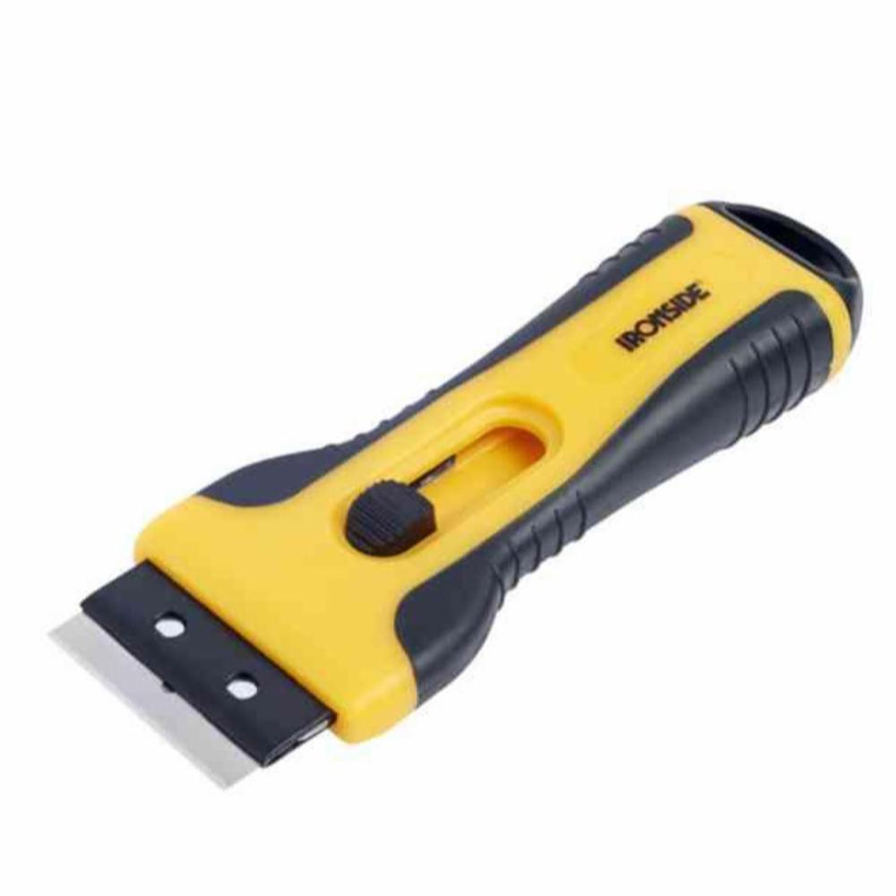 Glasskrape med tokomponentgrep og skyvbart blad. Bladmagasin for 4 blad inni grepet. Bladbredde: 39 mm. Mål skrape: 130 x 50 mm. Leveres med 5 stk blad.