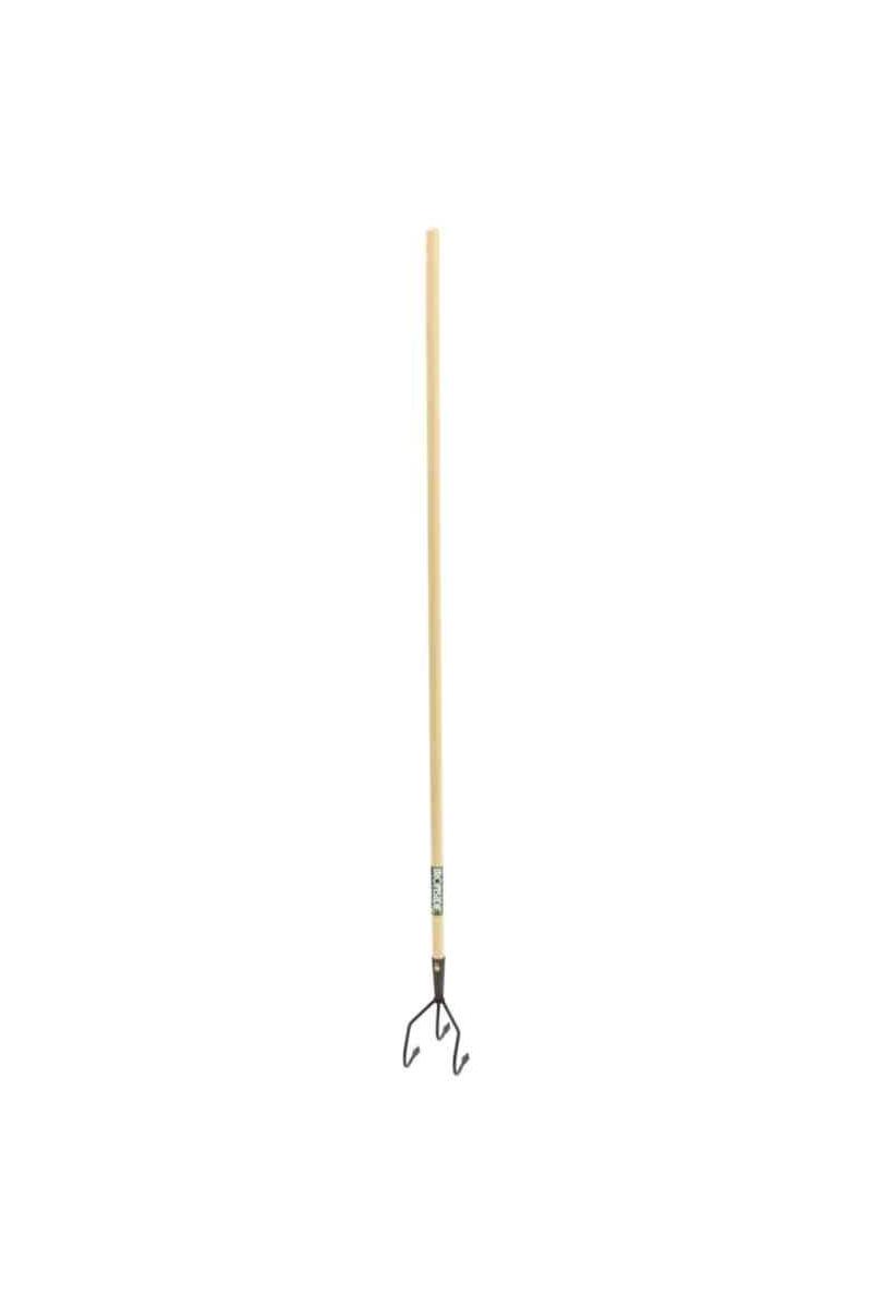 Solid kultivator med 3 klør av pressede stålpinner. Bredde: 150 mm. Lakkert furuskaft: Ø 26 mm. Total lengde: 1600 mm.