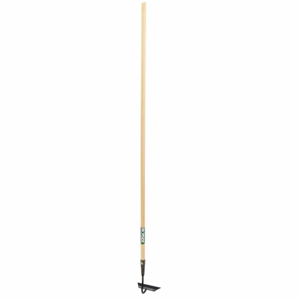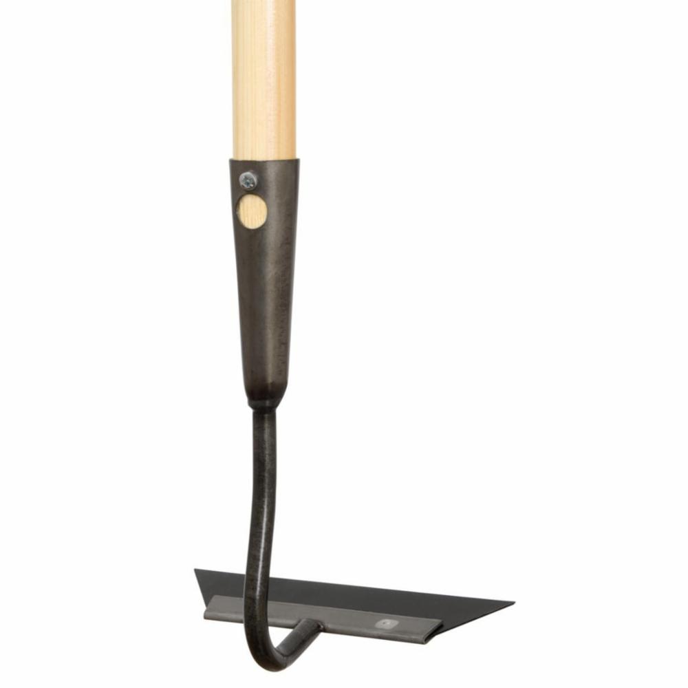 Rensehakke med blad av fjærstål, 155 mm bred. Lakkert furuskaft: Ø 26 mm. Total lengde: 1650 mm.