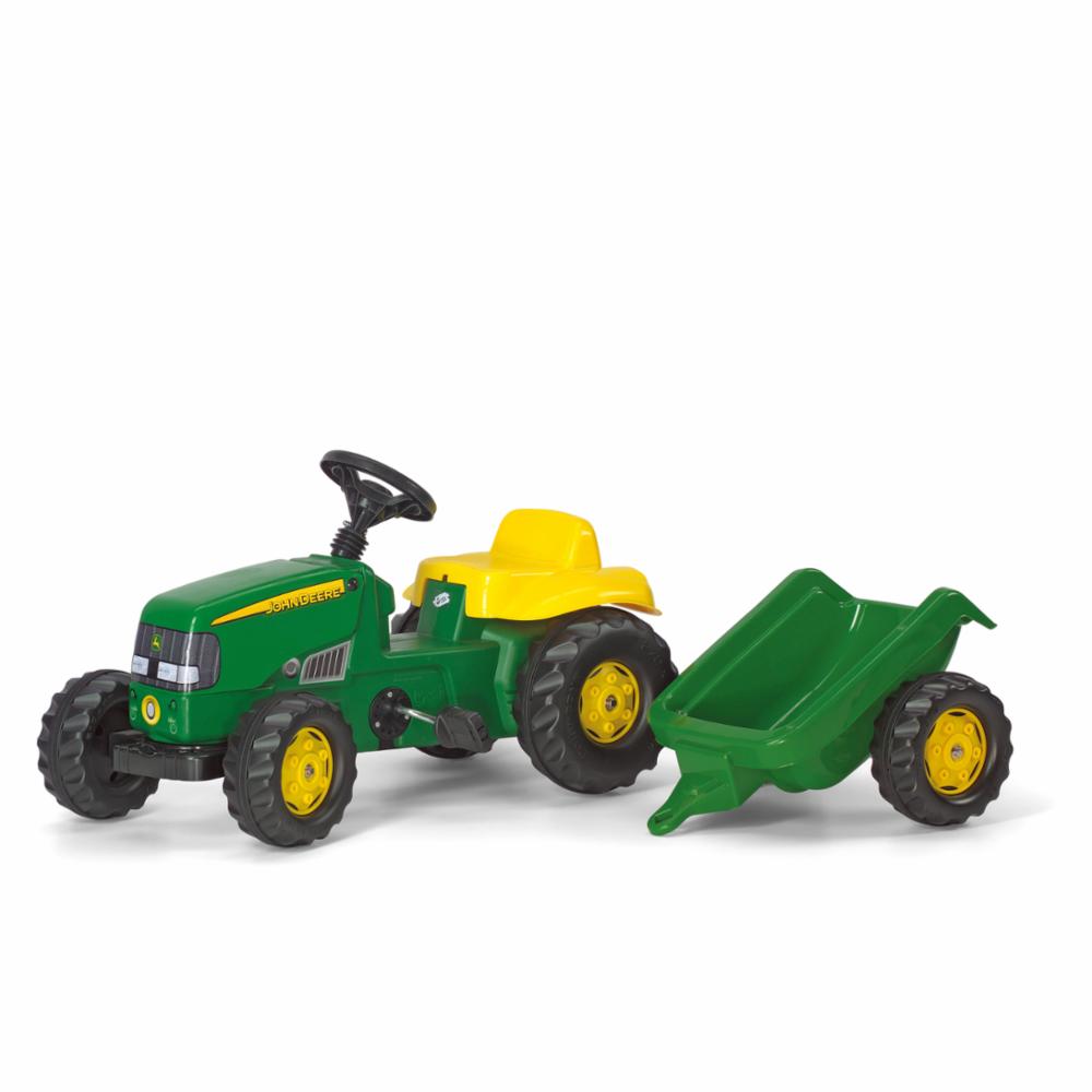 Tøff miniutgave av John Deere tråtraktor som er enkel å trå for de minste. Pakken inneholder både mini tråtraktor og henger. Produsert i kraftig velholdt plast av den kjente leketøy produsenten Rolls Toys.