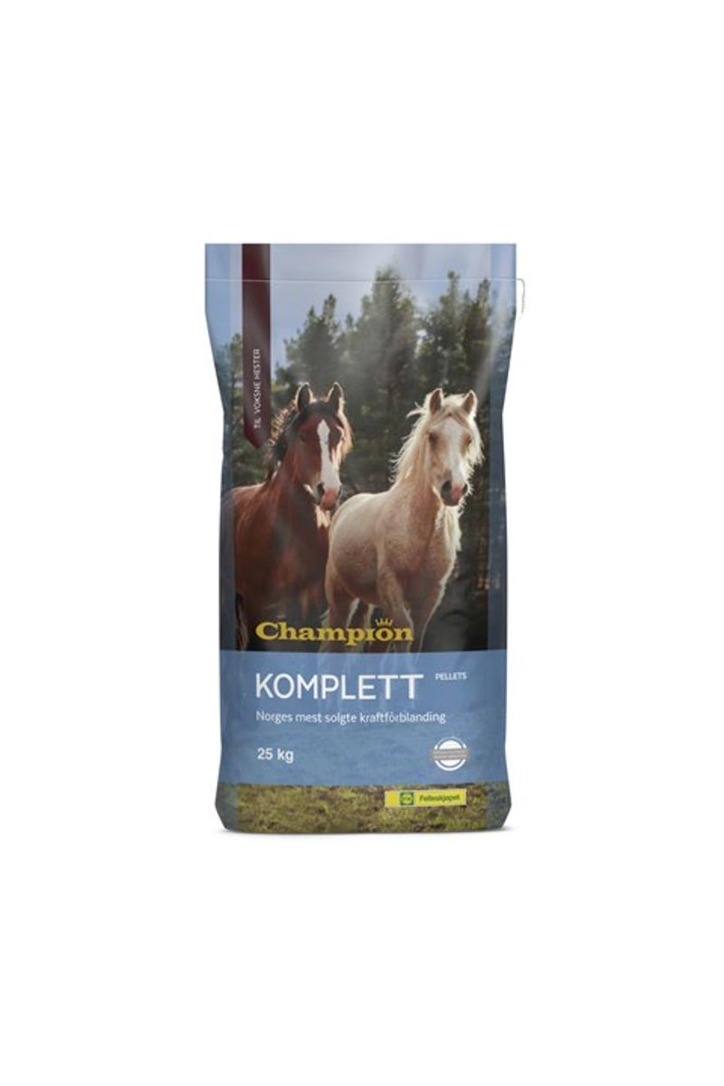 Champion Komplett gir en stabil, enkel og sikker fôring, uavhengig av hestens størrelse og rase. Inneholder havre, og har ca 28 % stivelse. Dekker sammen med grovfôrraasjonen hestens vitamin- og mineralbehov ved bruk av 0,5-0,6 kg per 100 kg kroppsvekt. Se vår Championbrosjyre for forslag til fôrplaner.
