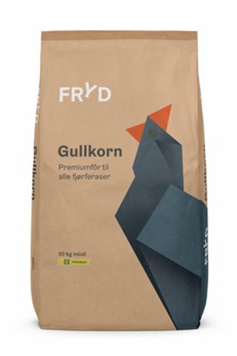Fryd Gullkorn har en fristende sammensetning som gjør at fuglen får mange smakfulle biter i fôret. Müsliens sammensetning gir god kråsfunksjon og fordøyelse, og bidrar til at fuglen får opprettholdt sin naturlige spiseatferd. Inneholder biter av mais og erter, samt helkorn av hvete. Viktige proteiner, mineraler og vitaminer er pelletert og blandet inn i fôret. Det anbefales derfor at alt fôret spises opp før det fylles på nytt. Fôret egner seg spesielt godt i blandede grupper med både eggleggende høns, haner og ungfugler. Til eggleggende høns er det nødvendig med ekstra tilskudd av kalsium, for eksempel skjellsand til frivillig opptak. Husk alltid tilgang til friskt vann.