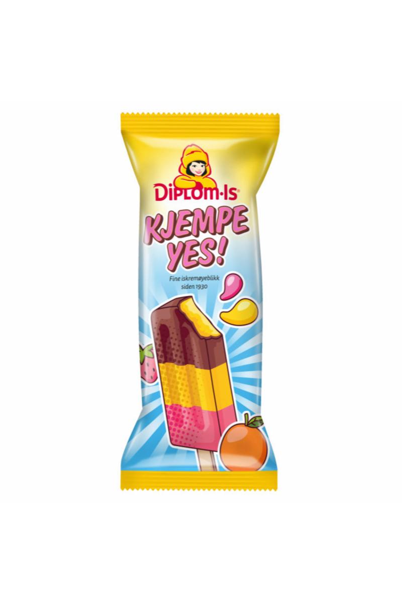 Deilig, myk saftis med smak av appelsin og jordbær og med sjokotupp.