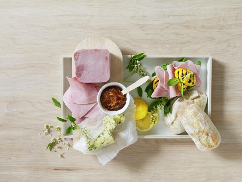 Renskåret svinekjøtt av skinke (85 %), vann, salt, dekstrose (mais), maltodekstrin (mais), stabilisator E450, E451, konserveringsmiddel E250, E261, E326, kaliumklorid (salterstatter), antioksidant E316.