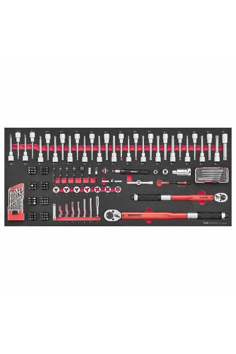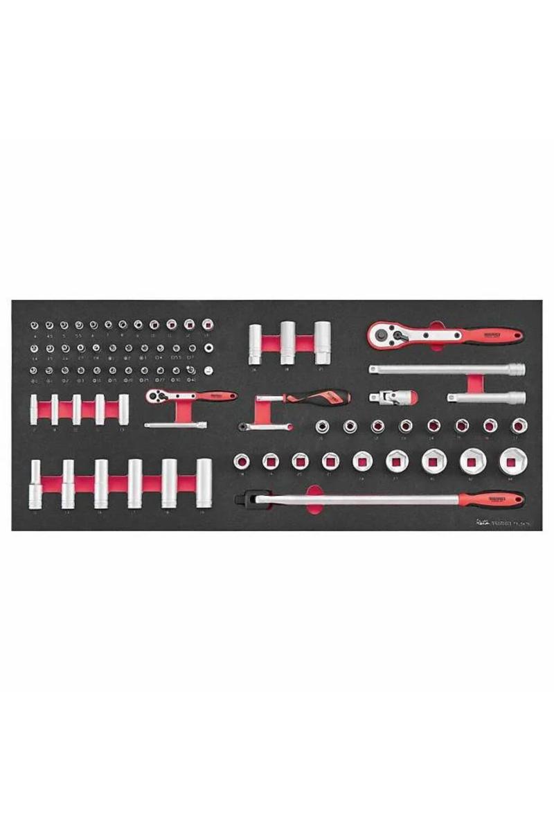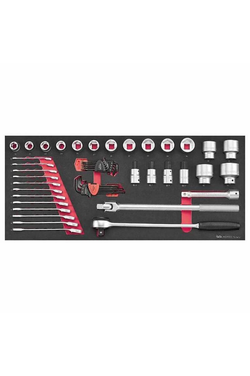 37'' verktøysett og arbeidsbenk med 525 deler beregnet for tung industri, lastebiler og anleggsmaskiner. Verktøyoppbevaring med åtte uttrekkbare skuffer, alle med kulelagerskinner og opptil 40 kg lastekapasitet. Svært slitesterk, pulverlakkert stålkonstruksjon med fosfatfri rustbeskyttelse (5-trinnsbehandling). Utstyrt med 5"-hjul. Alle verktøyene ligger i presisjonsskåret EVA-skum, noe som gjør det enklere å holde orden og se om det mangler verktøy. Kombinasjonslås med tre siffer. Skuff 1: piper og skralle. Skuff 2: pipesett og håndtak. Skuff 3: piper og skralle med 3/4"-feste. Skuff 4: u-ringnøkler (flere av visse størrelser). Skuff 5: skrutrekkere. Skuff 6: tenger. Skuff 7: slagverktøy. Skuff 8: kraftpiper med 1/2"-feste.