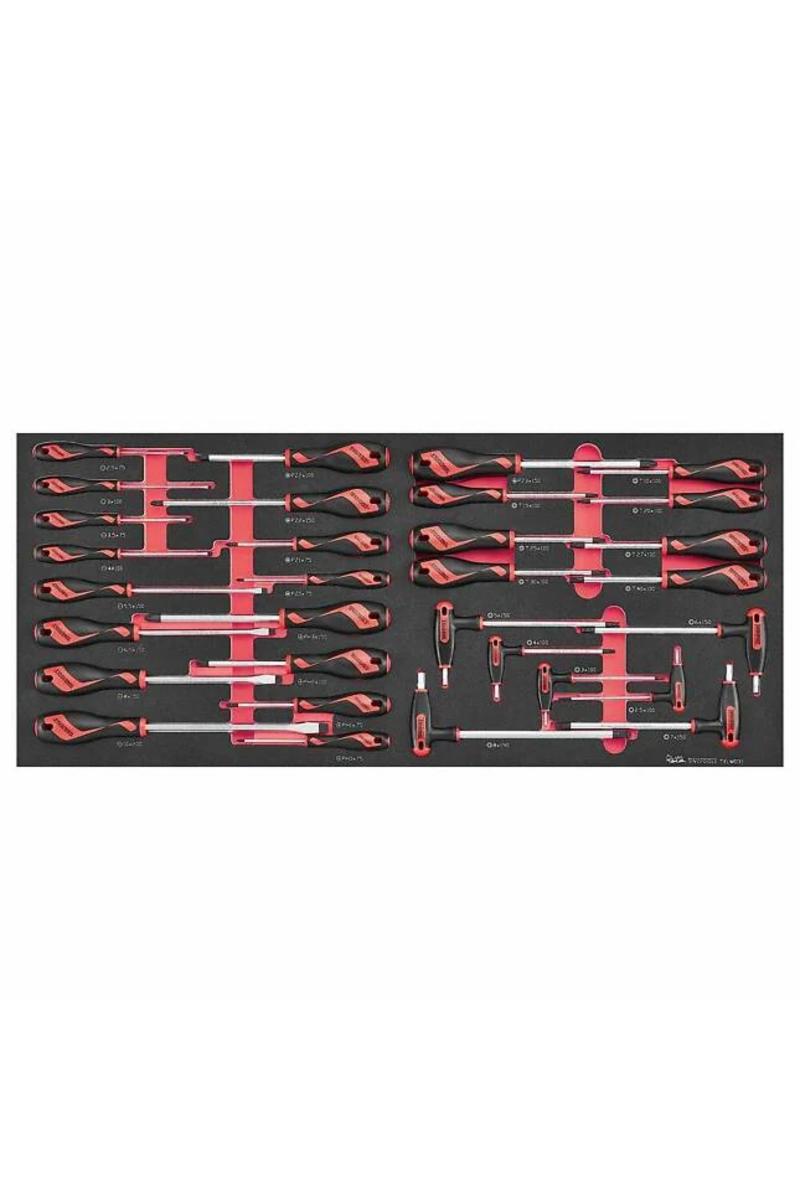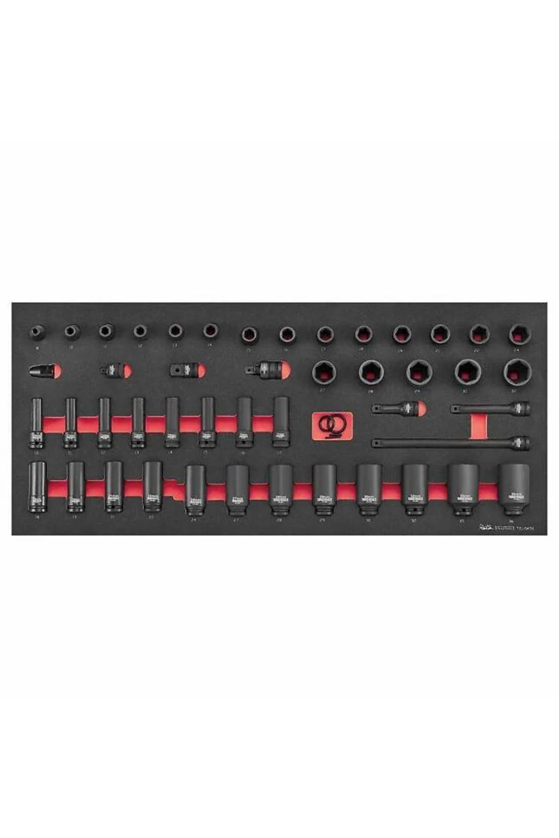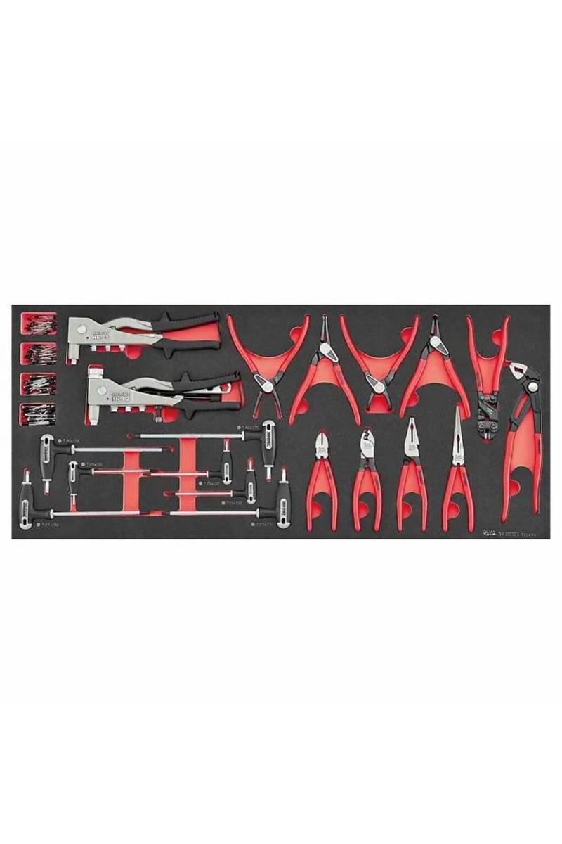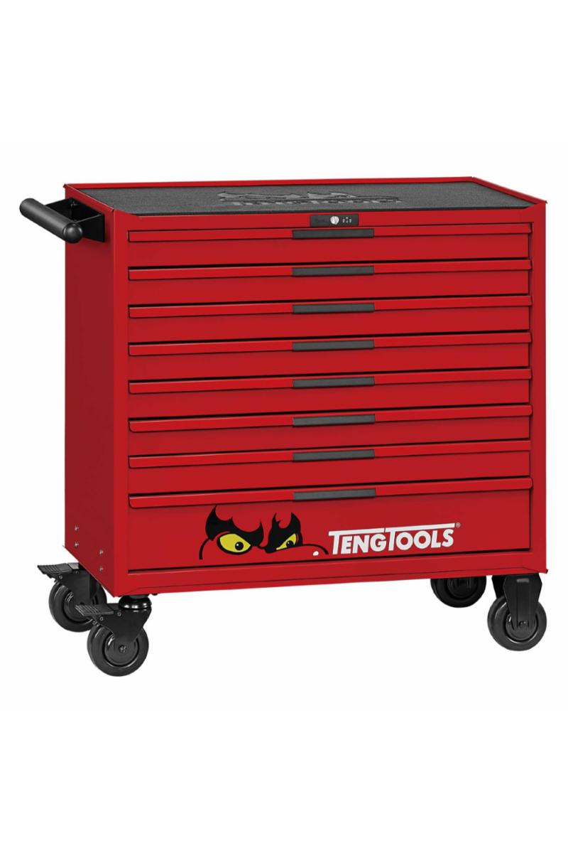 37'' verktøysett og arbeidsbenk med 525 deler beregnet for tung industri, lastebiler og anleggsmaskiner. Verktøyoppbevaring med åtte uttrekkbare skuffer, alle med kulelagerskinner og opptil 40 kg lastekapasitet. Svært slitesterk, pulverlakkert stålkonstruksjon med fosfatfri rustbeskyttelse (5-trinnsbehandling). Utstyrt med 5"-hjul. Alle verktøyene ligger i presisjonsskåret EVA-skum, noe som gjør det enklere å holde orden og se om det mangler verktøy. Kombinasjonslås med tre siffer. Skuff 1: piper og skralle. Skuff 2: pipesett og håndtak. Skuff 3: piper og skralle med 3/4"-feste. Skuff 4: u-ringnøkler (flere av visse størrelser). Skuff 5: skrutrekkere. Skuff 6: tenger. Skuff 7: slagverktøy. Skuff 8: kraftpiper med 1/2"-feste.